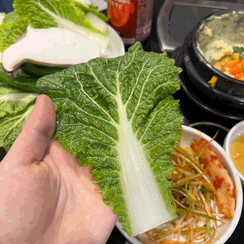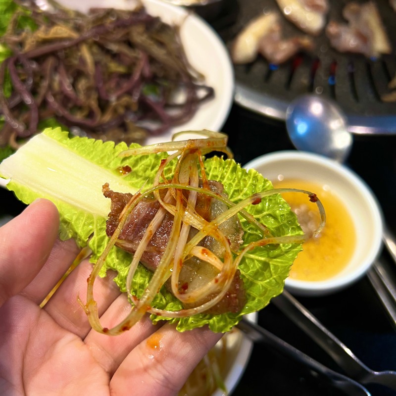배추에 고기올려 존맛탱인 파무침 올려 김치에 마늘 쌈장 야무지게올려서 왼손에 딱 잡고